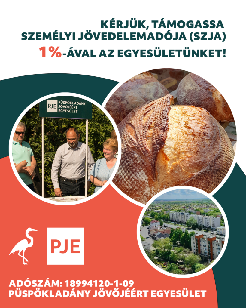 Bárhol is élsz, arra kérünk, támogasd adód 1%-ával a Püspökladány Jövőjéért Egyesületet! Az elmúlt időszakban bebizonyítottuk: ha a ladányiak összefognak, valódi eredményeket tudunk elérni. Mi nemcsak beszélünk a közösség erejéről, hanem nap mint nap teszünk is érte.